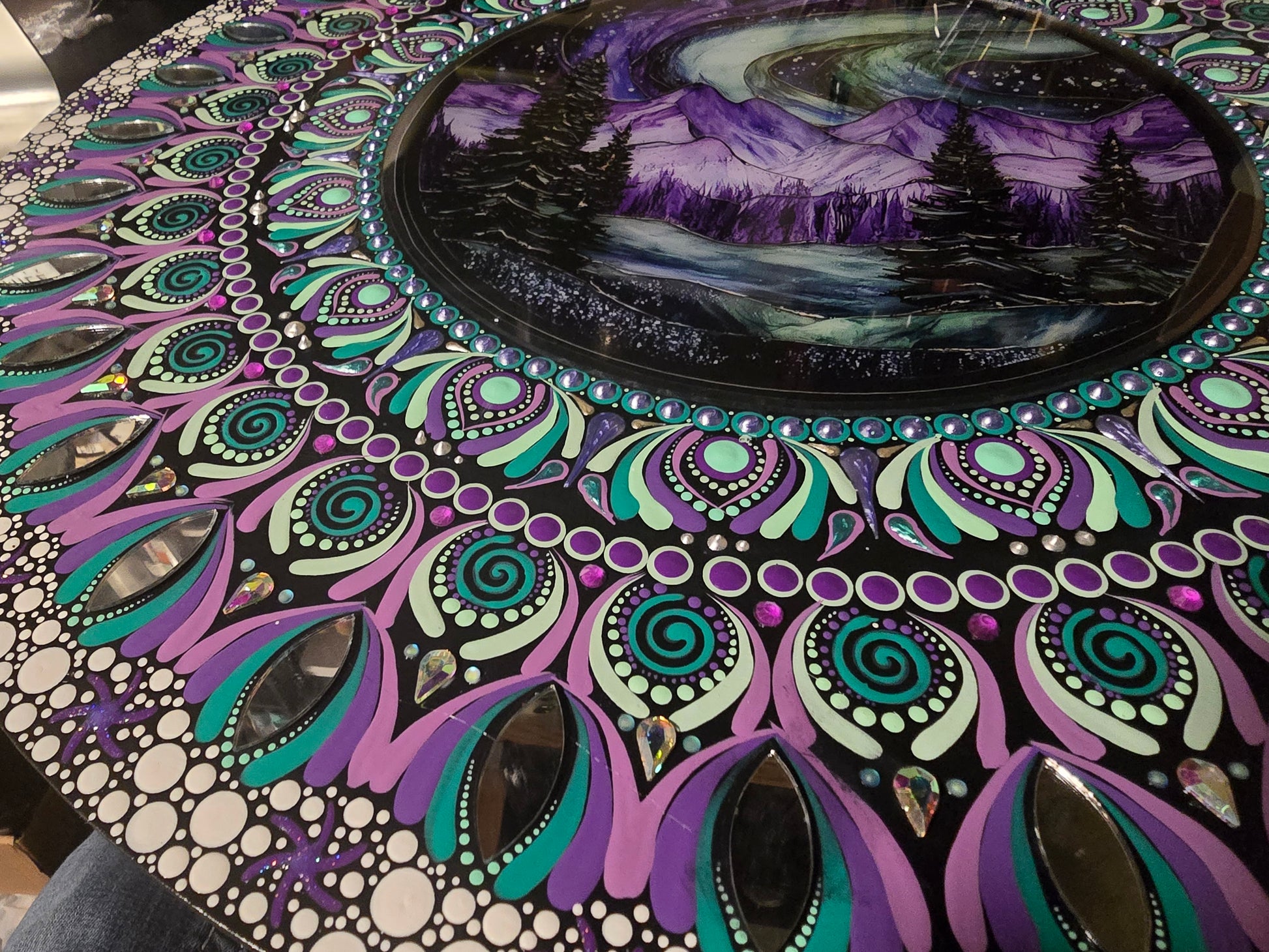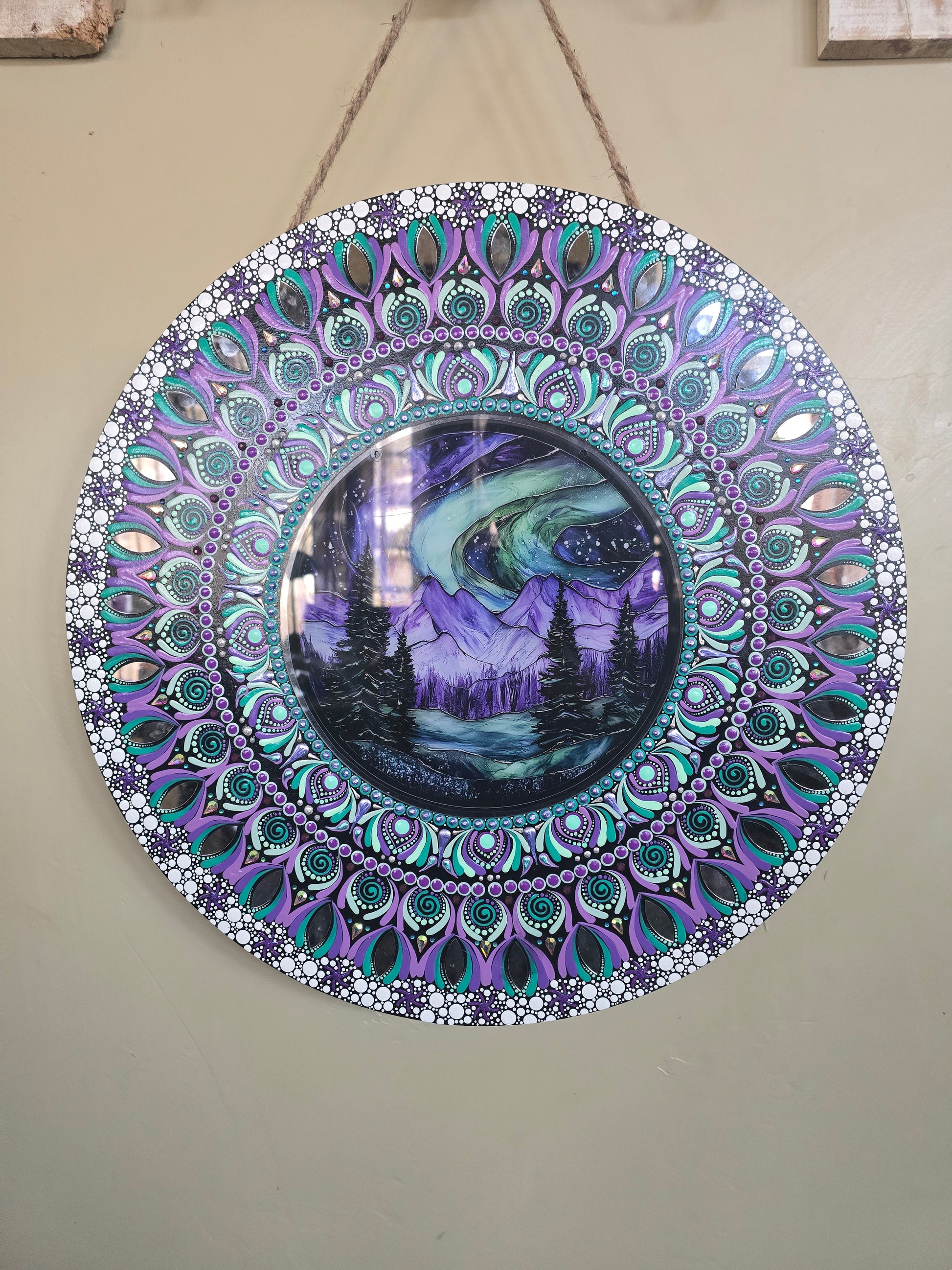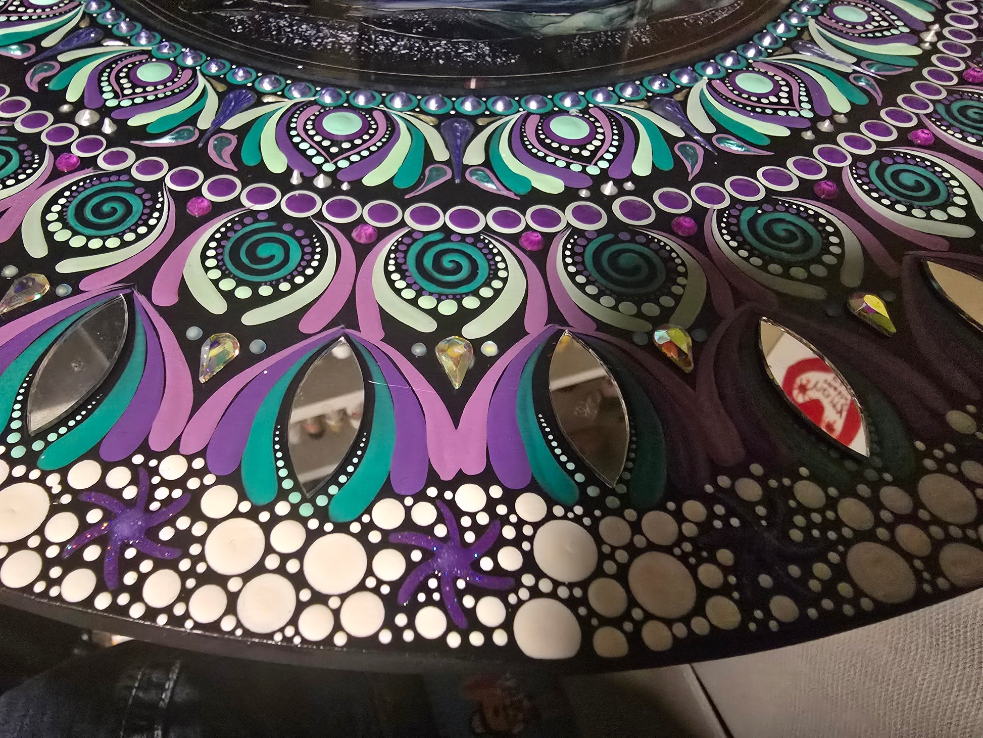 This is a beautiful piece, I have hand painted around the center picture. This has been hand painted with acrylic paint and 3D dimensional paint. It has some gem stones and mirrors to add to the beauty. This is a 19 in round.