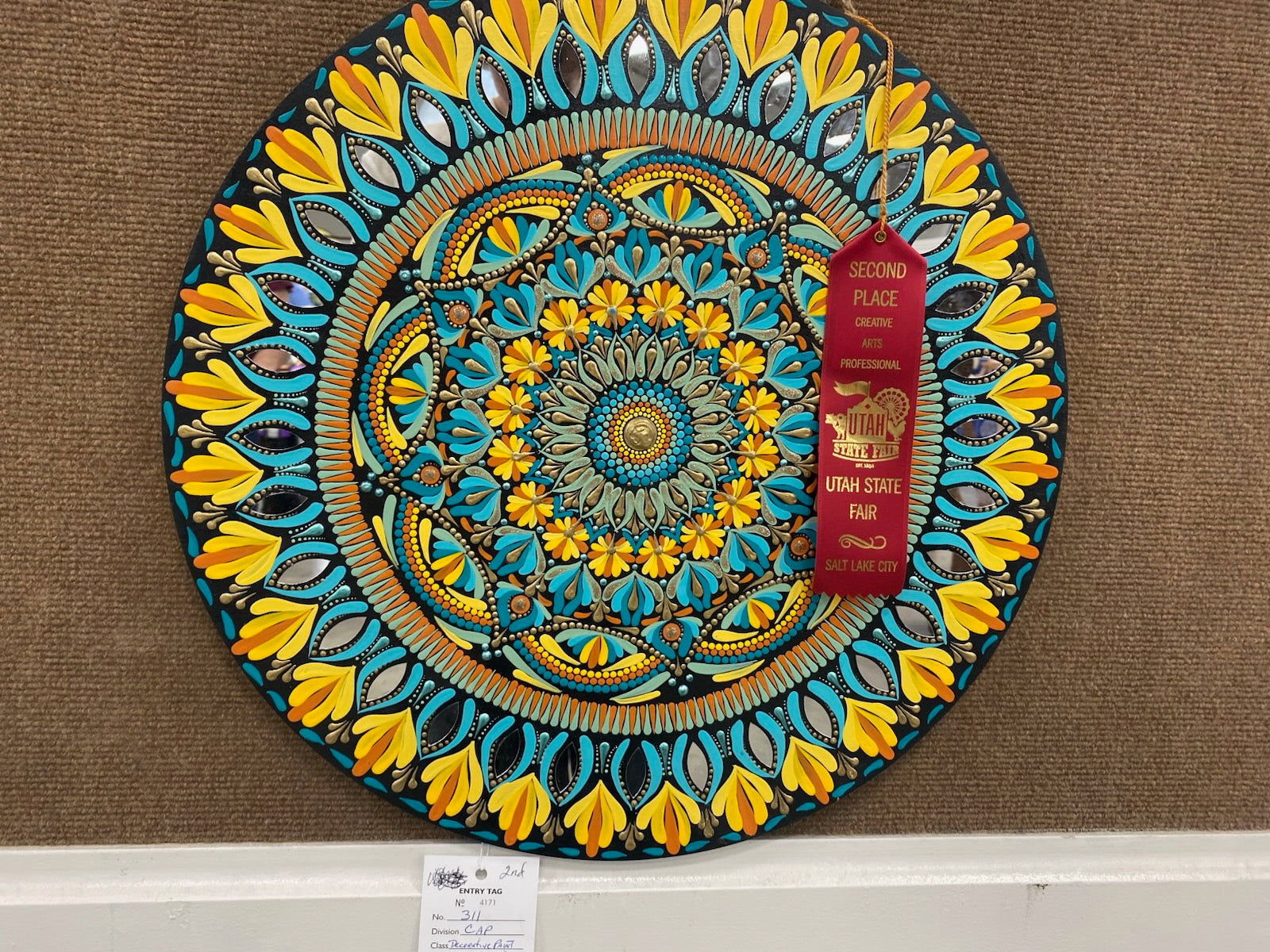 This is a hand painted 19 in wood round mandala. It has real glass mirrors. I put this into my state fair and was awarded 2nd place for this beautiful one of a kind. I put my own little unique touches on this peice. Yellows and blues are so pretty together.